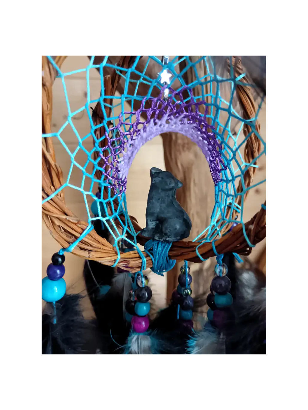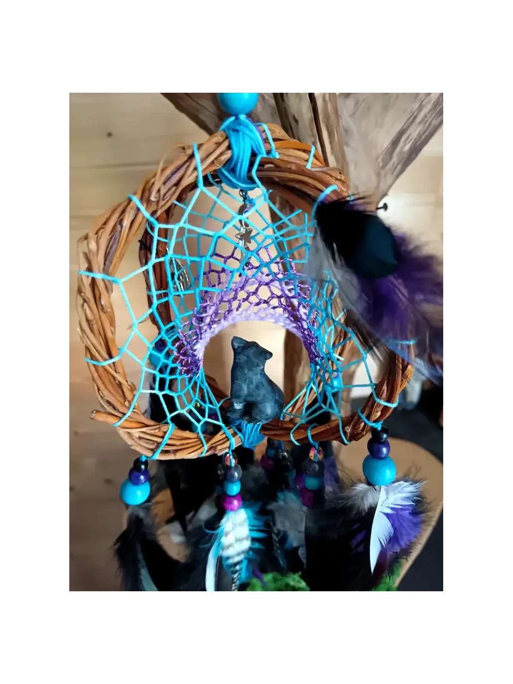Im Herzen der uralten Wälder, wo der Nebel mit dem Mondlicht tanzt, erklingt "Der Atem des blauen Wolfs". Als exklusive und energetische Kreation der Boutique Les Plumes d'Amazone ist dieser 3D-Traumfänger nicht nur ein dekoratives Objekt; er ist ein wahres heiliges Portal zu Ihrer inneren Welt. Mit reiner Absicht handgewebt, fängt sein hypnotisches Trichtergewebe in einem Farbverlauf aus Himmelblau und mystischem Violett die wandernden Energien der Nacht ein, um nur Licht, Weisheit und heilende Träume durchzulassen.