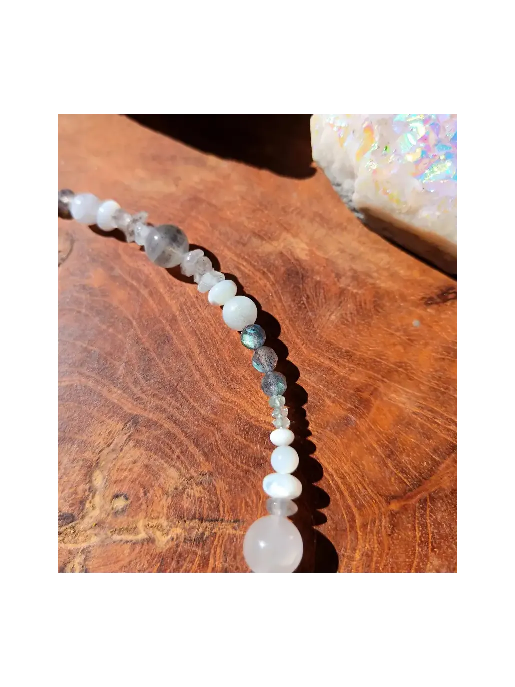 Sekundäre Steine & Kristalle: Perlen aus weißem Labradorit, klassischem Labradorit, echtem Perlmutt, Hämatit-Mond und roher Herkimer-Diamant.