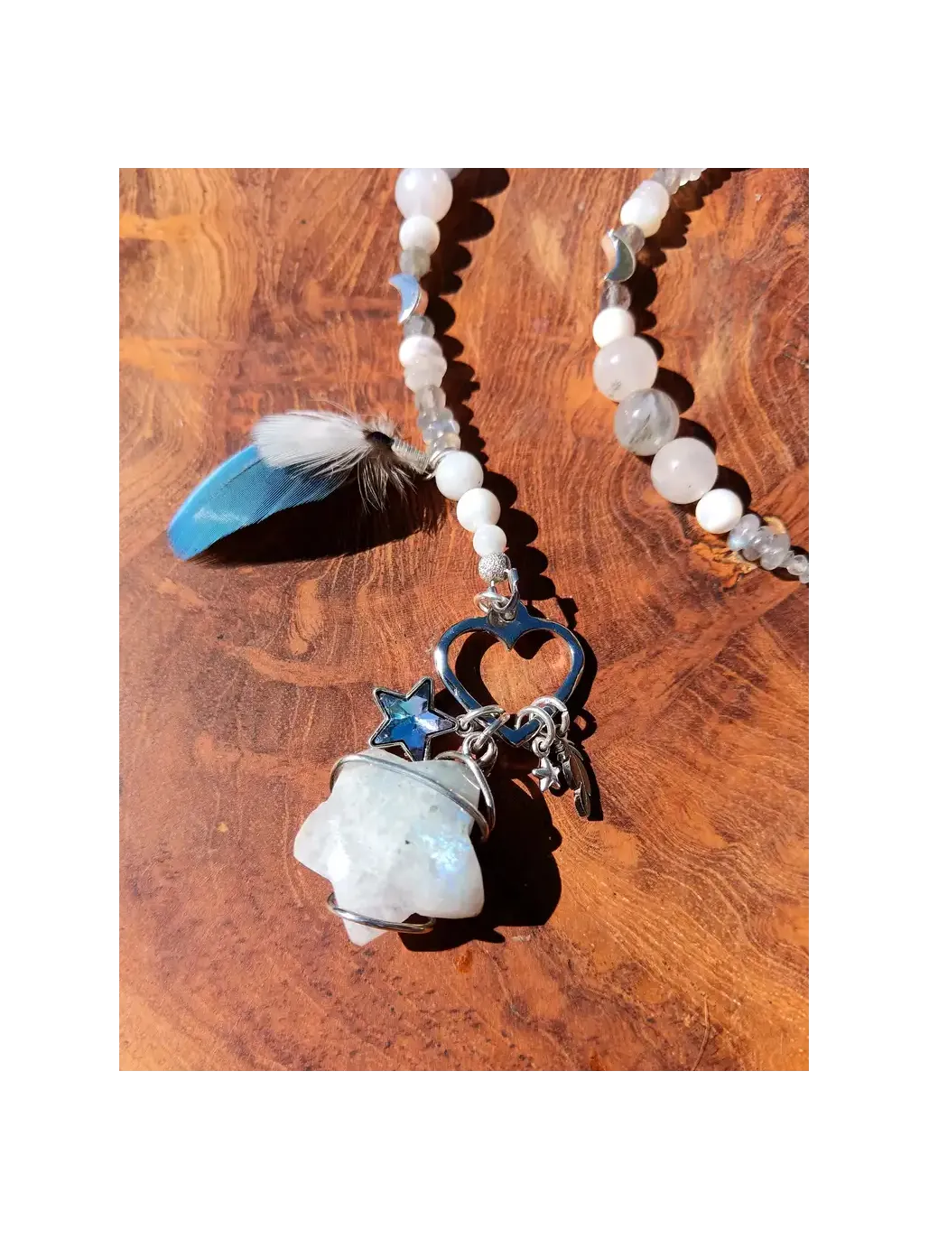 Die Magie dieser Kette liegt in ihrer Symphonie aus Texturen und Energien. Um das zentrale Gestirn kreisen milchige Perlmuttperlen, mystisch schillernder Labradorit und ein strahlender Herkimer-Diamant, ein wahrer Lichtverstärker. Ein zarter Hämatit-Mond verankert diese himmlischen Energien und erinnert uns daran, dass wir selbst in den Weiten des Kosmos mit Mutter Erde verbunden bleiben. Der Verschluss, genial und symbolisch an der Vorderseite der Kette platziert, ermöglicht es Ihnen, Ihre spirituelle Intention selbst auf Ihrem Herzchakra zu versiegeln, während er gleichzeitig wunderschöne, in Form von Federn und Sternen geschmiedete Edelstahlanhänger in Szene setzt.