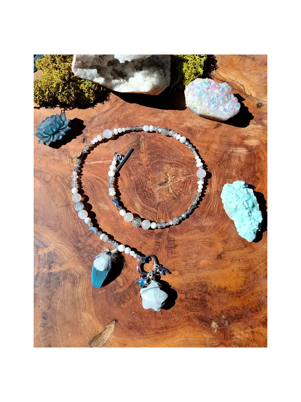 Weißer Labradorit (Hauptstein): Oft als Regenbogenmondstein bezeichnet, ist er der ultimative Stein der Magie, der Intuition und der heiligen Weiblichkeit. In der Lithotherapie wirkt er als Lichtschild, das die Aura schützt und gleichzeitig das Kronenchakra für außersinnliche Wahrnehmungen und geistige Klarheit öffnet.