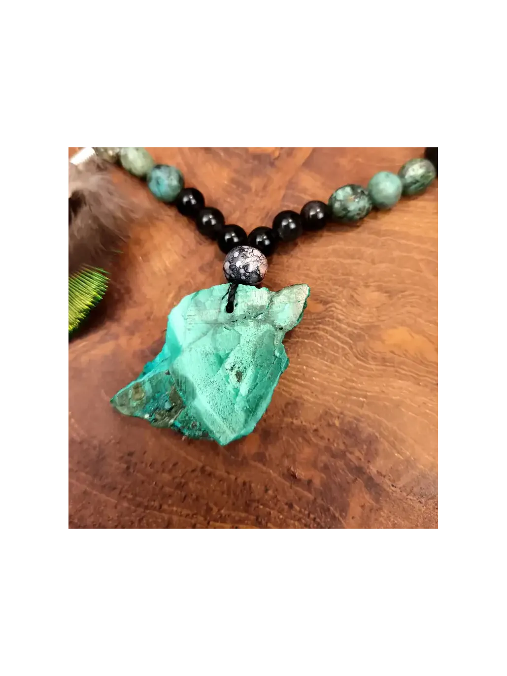 Im Zentrum dieses Talismans vibriert eine Scheibe aus rohem Malachit, ein wahrer Schild für das Herzchakra, ausgewählt wegen seiner Fähigkeit, dissonante Energien zu absorbieren und alte, blockierende Muster aufzudecken. Er ist der Kern Ihrer Transformation. Unterstützt wird diese Schwingung durch eine bewusste Anordnung von Silberobsidian-Perlen, die als spiritueller Anker dienen, Sie fest mit Mutter Erde verbinden und gleichzeitig die Wahrheit Ihrer Seele widerspiegeln. Ein edles Ensemble aus Pfauen- und Königsfasanenfedern erhebt sich aus dem Stein und fungiert als spirituelle Antenne, um Ihre Aura zu reinigen und Ihre Vision in höhere Sphären zu lenken. Es ist die pure Essenz schamanischer Heilkunst.