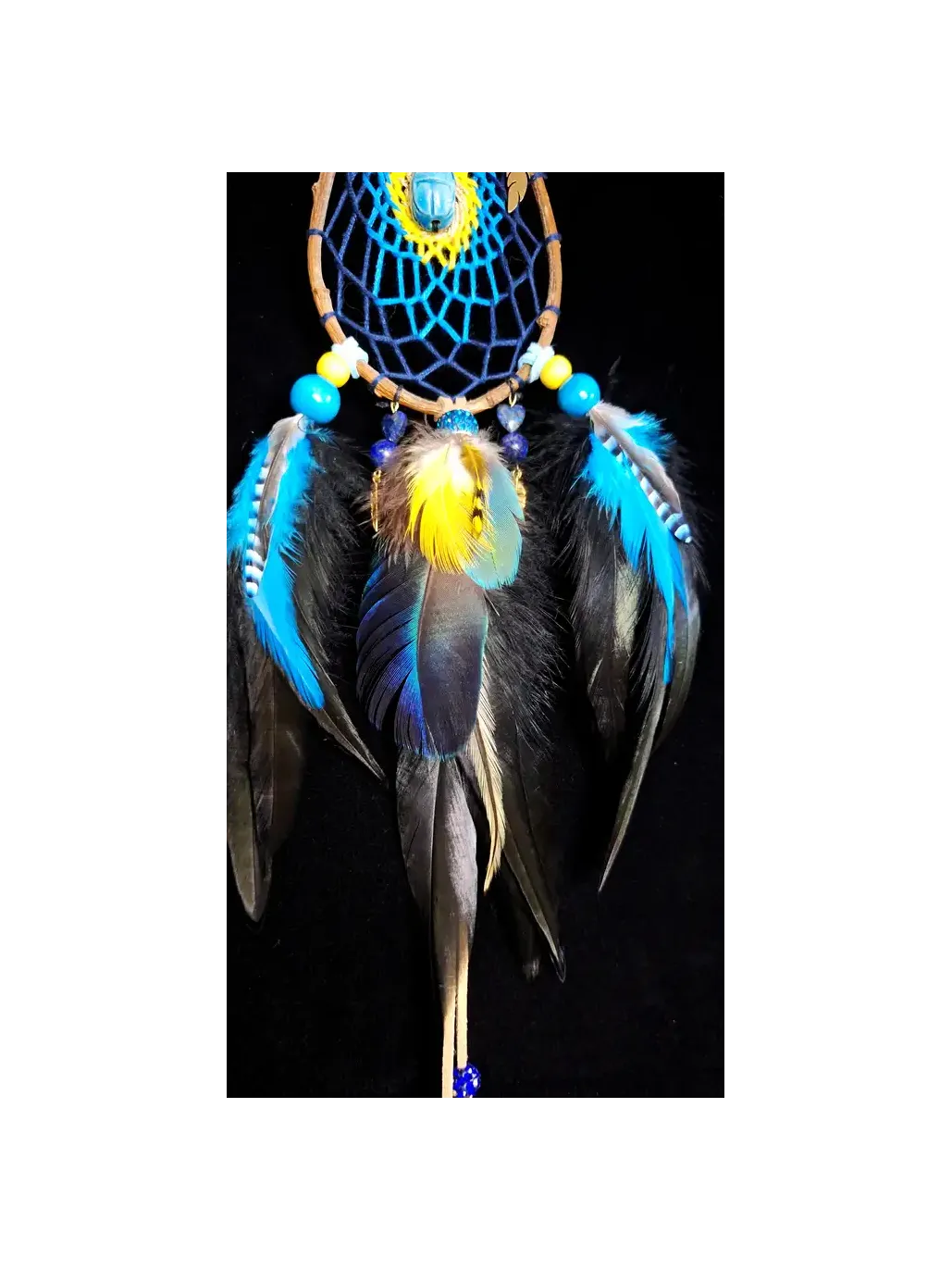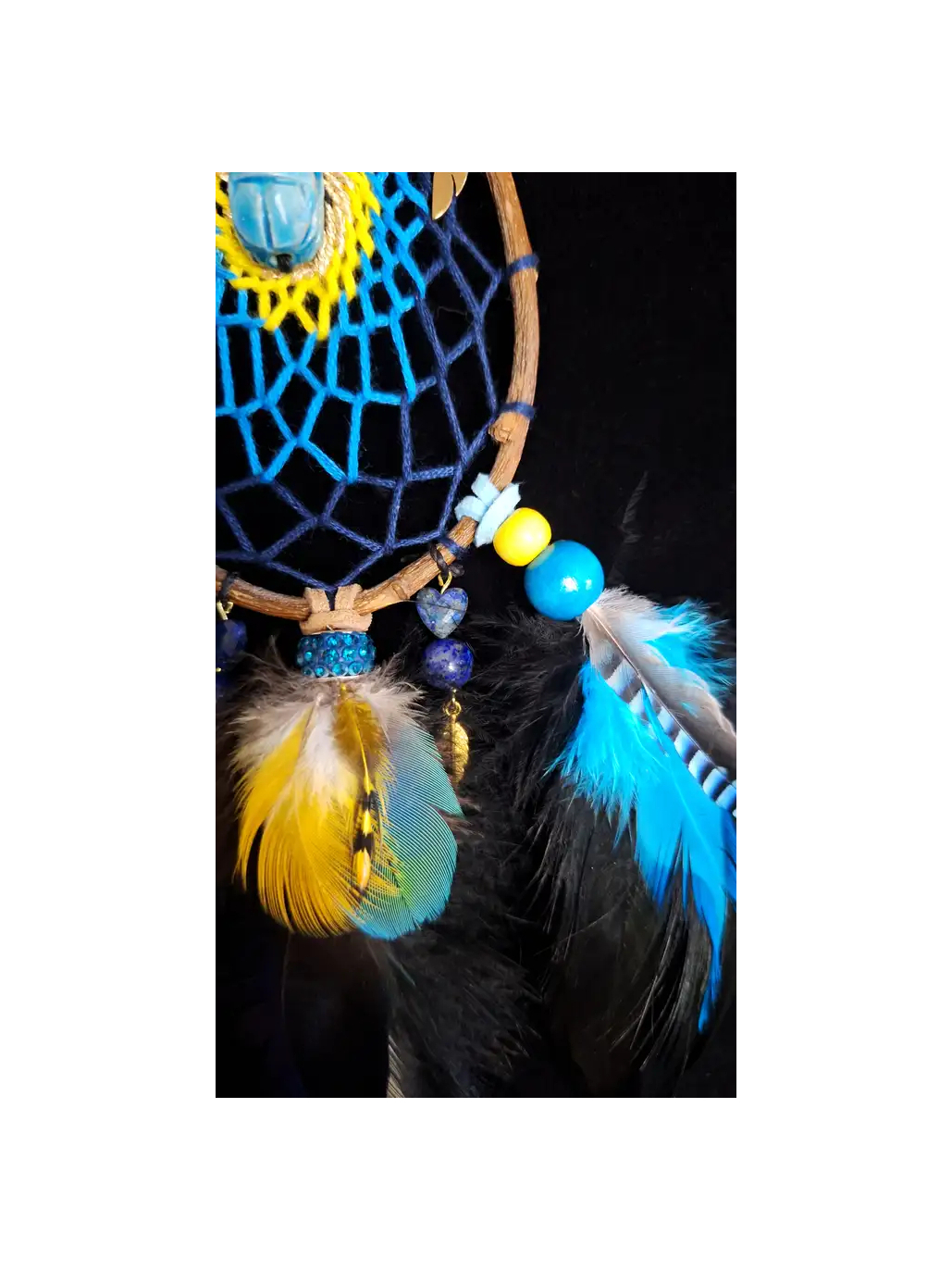Le scarabée sacré veille désormais sur vos nuits dans cet attrape-rêves en forme de goutte, son corps de stéatite bleue enchâssé au cœur d'une toile tissée entre le cobalt de minuit et l'or solaire.