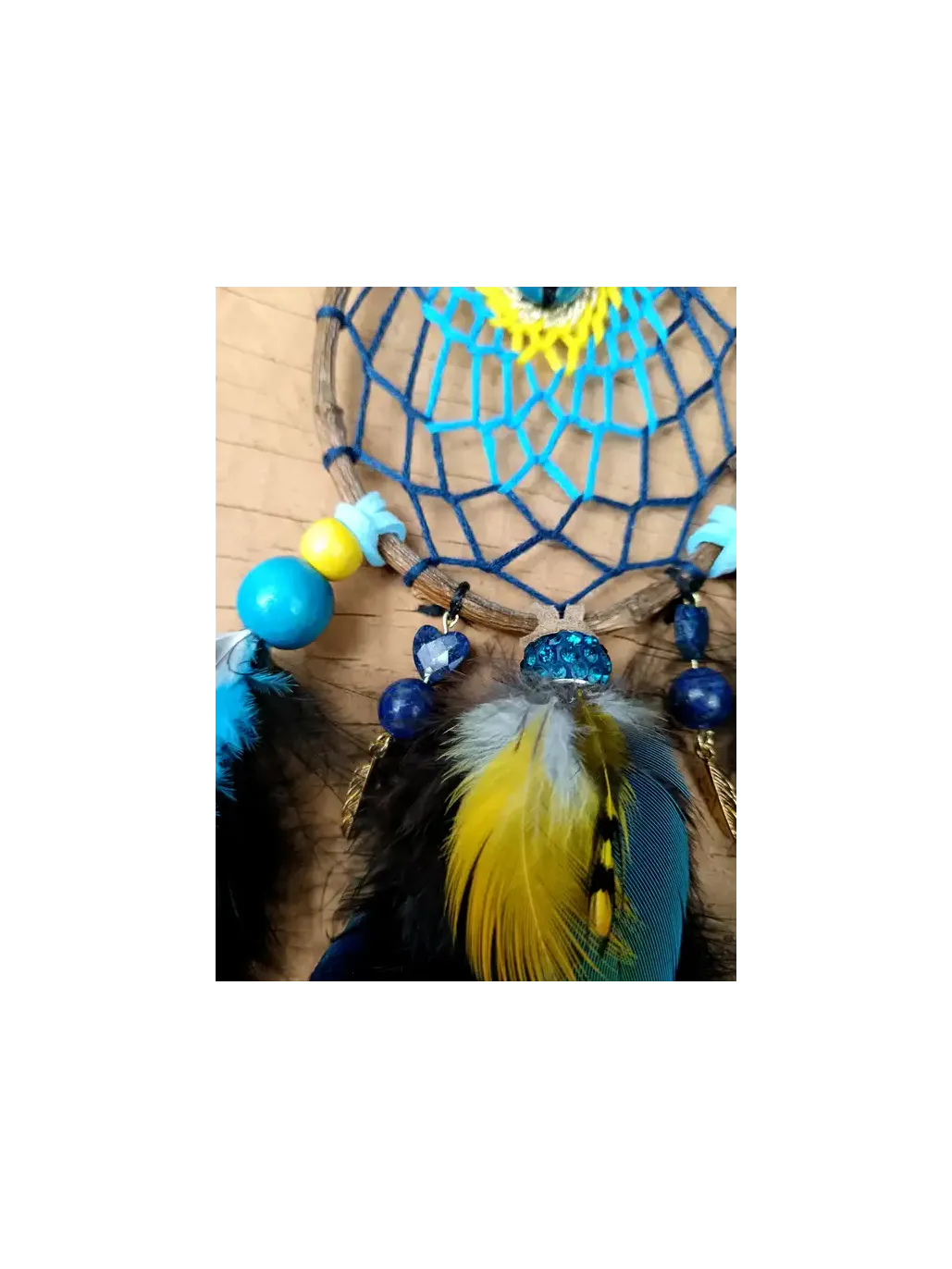 ✦ Un Feu Visuel Saisissant. Le contraste entre le bleu nuit profond de la toile, le jaune solaire de la spirale centrale, les éclats turquoise-or-vert des plumes et l'étoile dorée crée un objet d'une beauté visuelle hypnotique. Accroché dans une chambre, il transforme instantanément l'espace en sanctuaire.