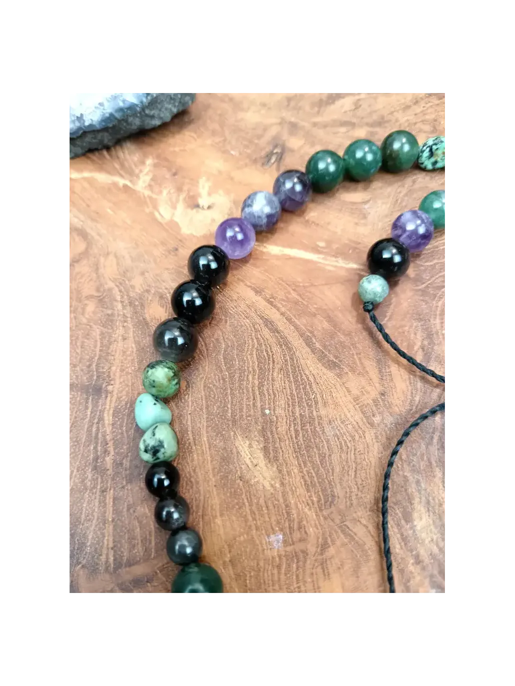 L'Améthyste & Turquoise Africaine (Sagesse & Communication) : L'améthyste élève la conscience et apaise le mental, reliant au Chakra couronne. La turquoise africaine favorise le changement, la communication juste et l'équilibre.