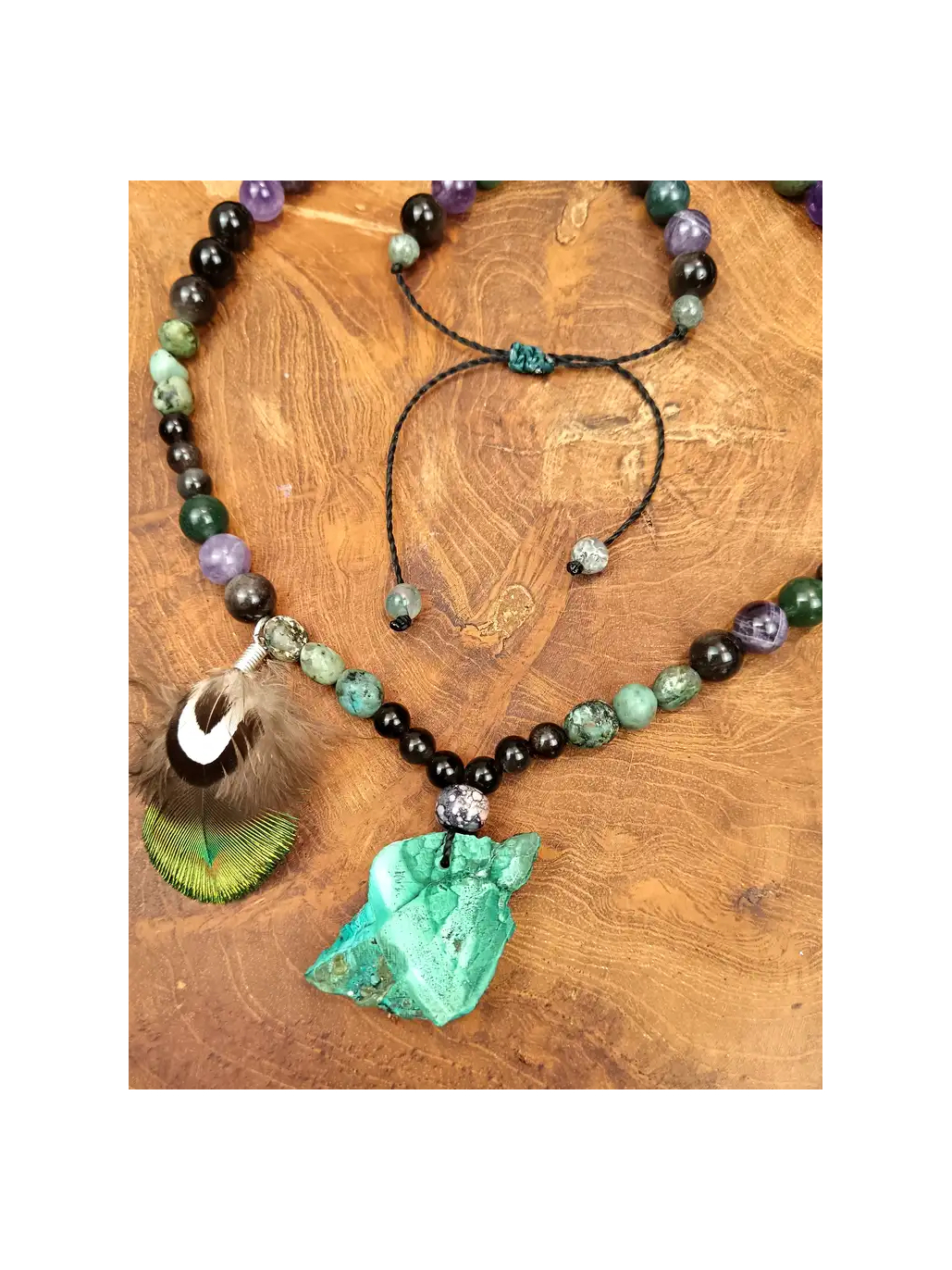 Au centre de ce talisman vibre une tranche de malachite brute, véritable bouclier du chakra du cœur, choisie pour sa capacité à absorber les énergies dissonantes et à révéler les anciens schémas bloquants. Elle est le noyau de votre transformation. Soutenant cette vibration, un alignement conscient de perles d'obsidienne argentée agit comme une ancre spirituelle, vous reliant fermement à la Terre Mère tout en réfléchissant la vérité de votre âme. Un assemblage noble de plumes de paon et de faisan vénéré s'élève de la pierre, agissant comme des antennes spirituelles pour purifier votre aura et guider votre vision vers des royaumes supérieurs. C'est l'essence même du soin chamanique incarnée.