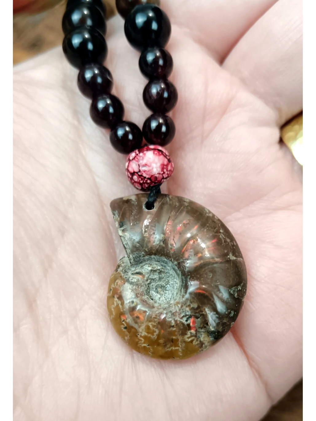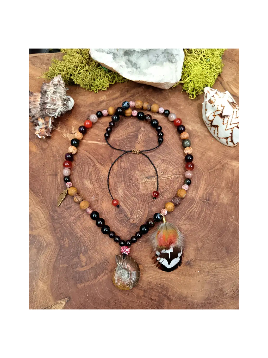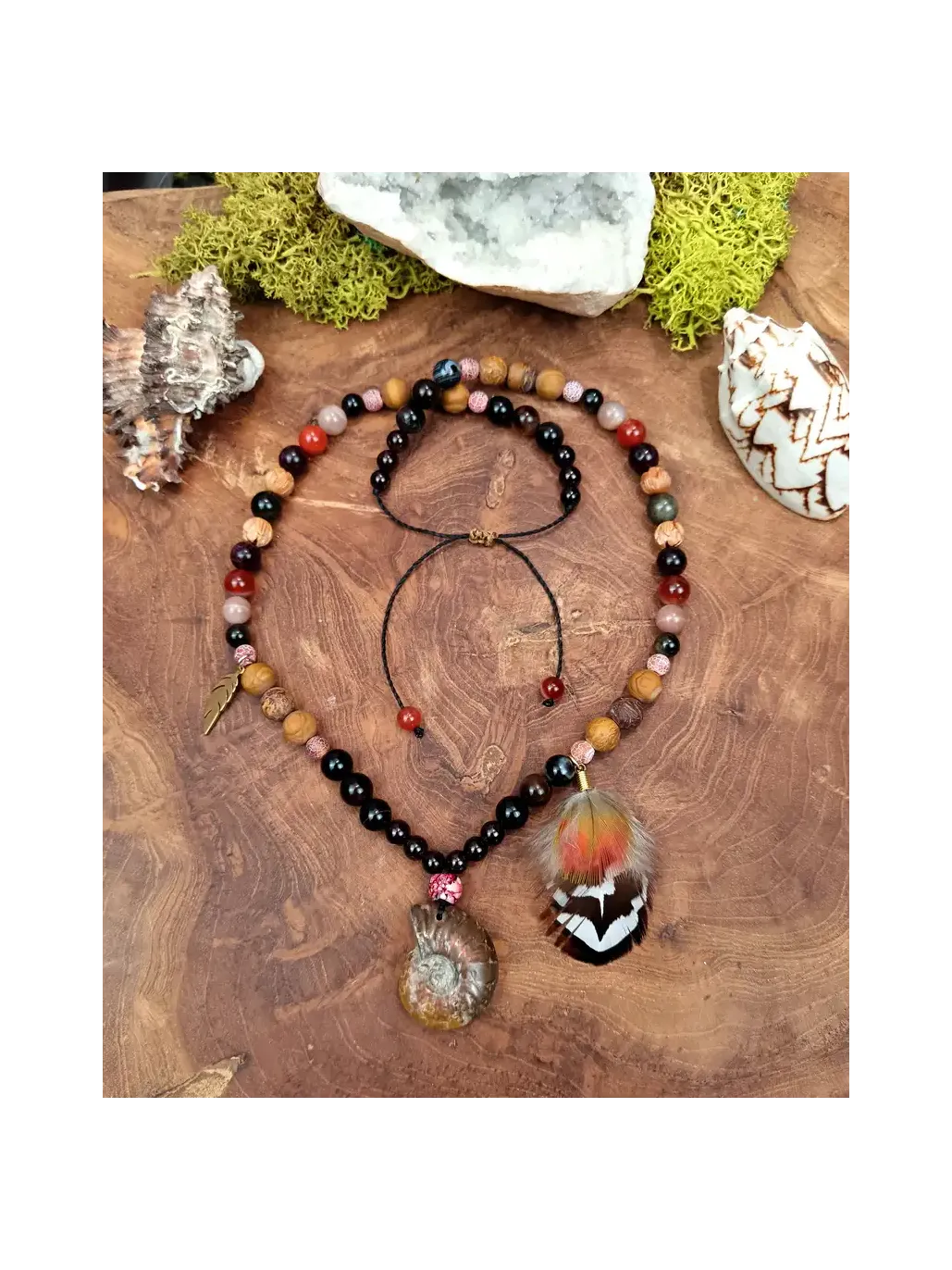 Au cœur de cette création palpite une somptueuse Ammonite irisée, fossile millénaire gardien des mémoires telluriques. Telle une spirale infinie, elle symbolise votre propre cheminement, une évolution constante vers votre véritable nature. Le lien qui l'accompagne est un tissage mystique mêlant des pierres naturelles puissantes et du bois sculpté en fleur de lotus, éveillant à la fois le guerrier pacifique et le sage qui cohabitent en vous.