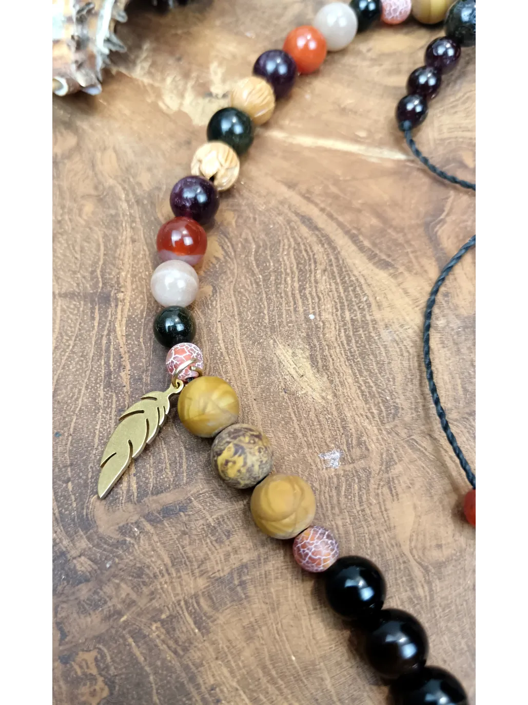 Les plumes d'oiseaux totems, traditionnelles messagères entre le monde physique et le monde des esprits, viennent couronner ce bijou d'une aura vibrante. En portant ce collier sur votre cœur, vous invitez la légèreté de l'Air et la solidité inébranlable de la Terre à s'unir. C'est une invitation à affirmer votre charisme, protégé par des énergies ancestrales, prêt à explorer les mystères de votre propre existence avec force et clarté.