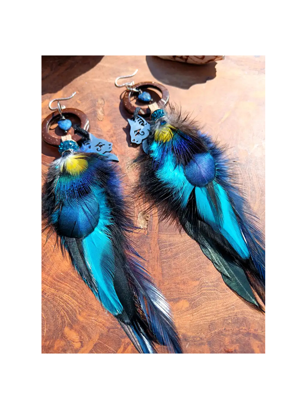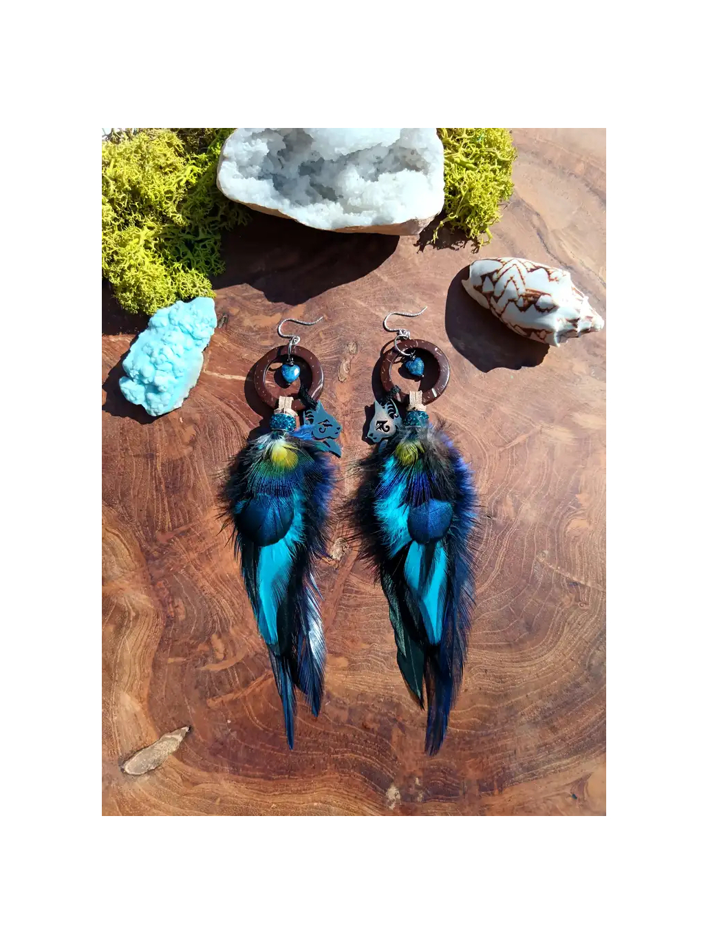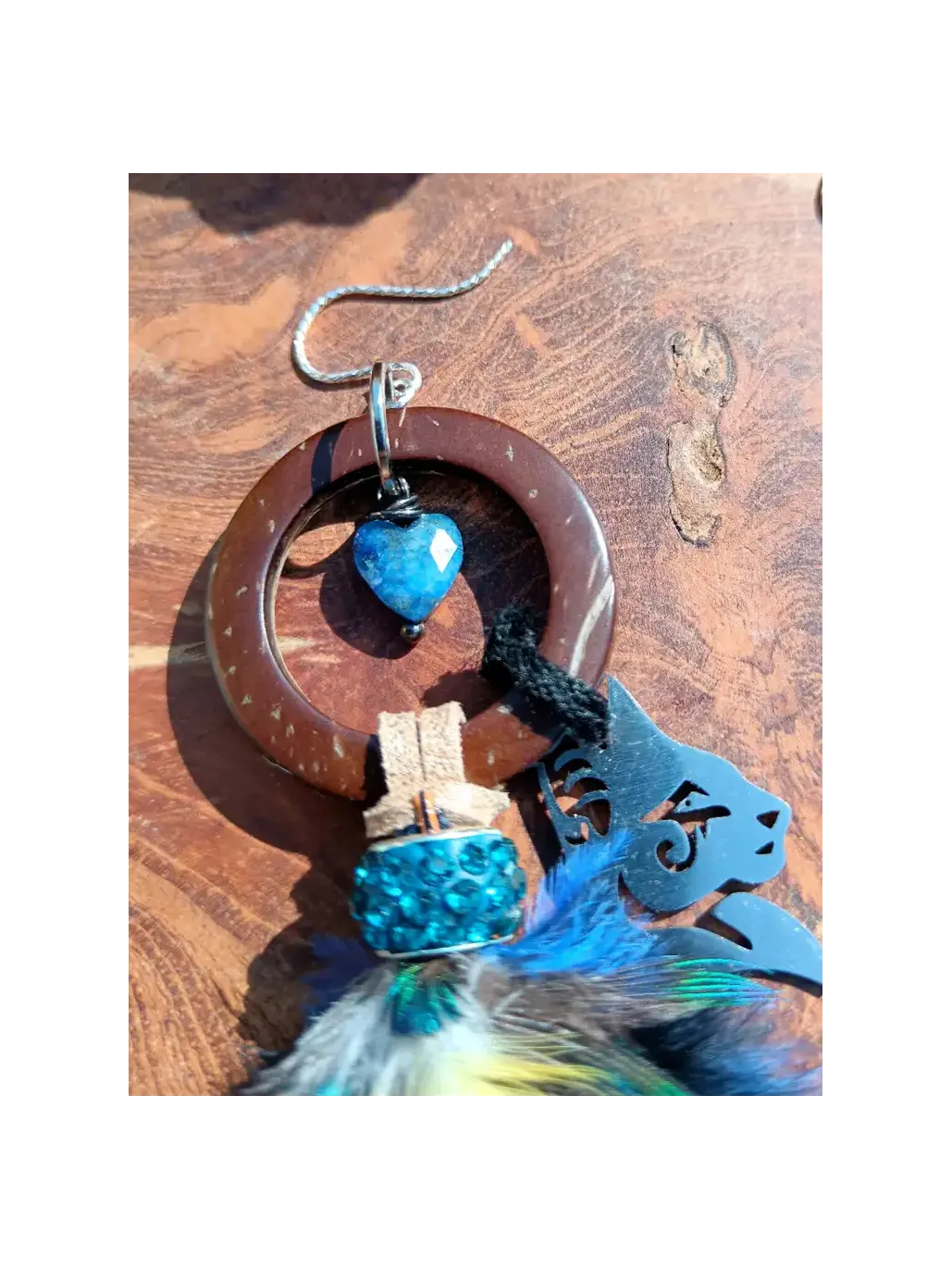 Au cœur de cette création vibratoire, un anneau en véritable noix de coco ancre votre esprit à la Terre, tandis qu'un cœur de Lapis Lazuli d'un bleu profond y est suspendu, tel un fragment d'univers. Sous cette voûte, la silhouette de la déesse Bastet en acier inoxydable veille silencieusement sur vous. Le majestueux panache de plumes (coq, paon aux reflets hypnotiques, perruche et faisan Palawan) déploie une cascade de bleus intenses. Ce bouclier d'air et de lumière opère une purification subtile de votre aura, repoussant les énergies dissonantes tout au long de la journée.