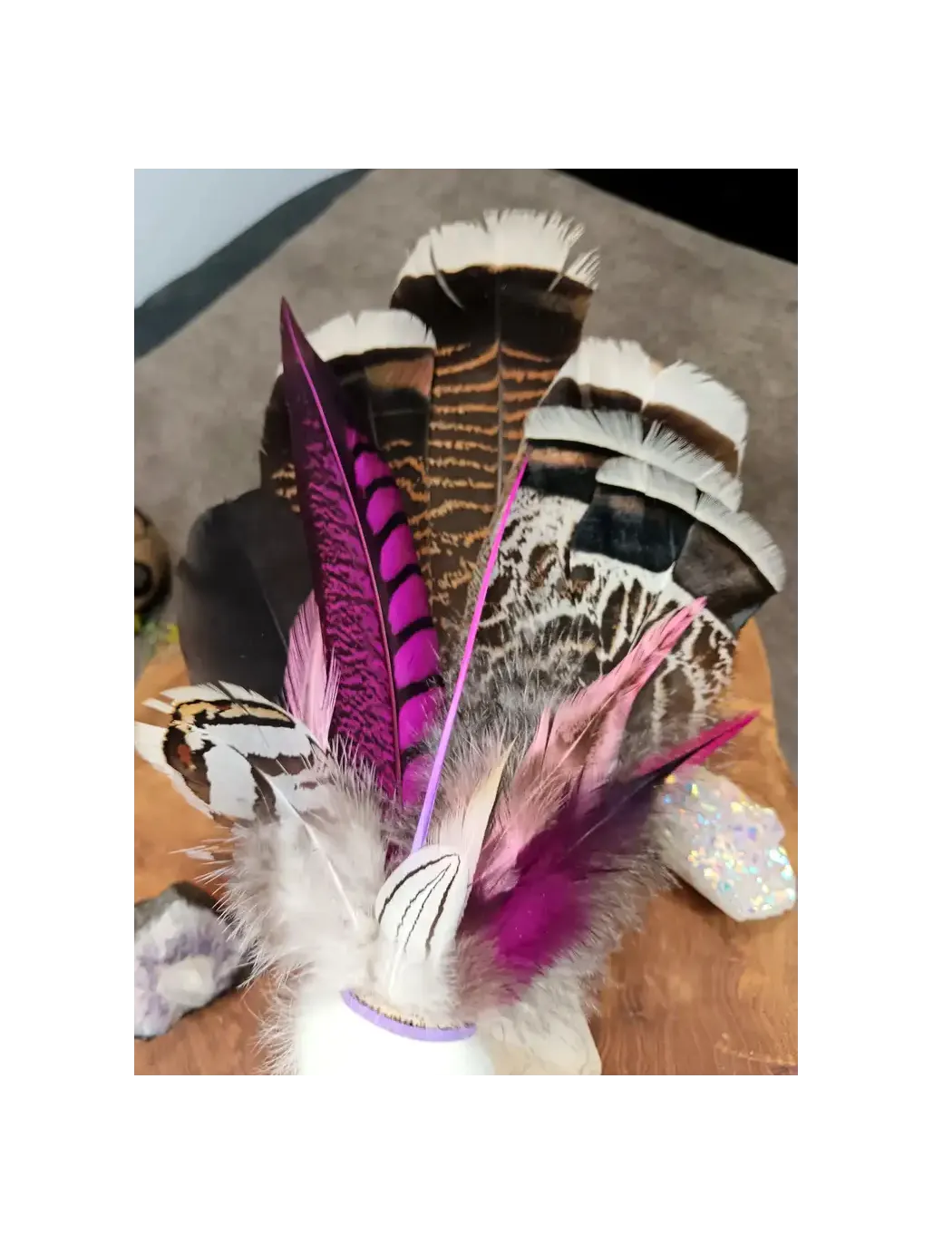 Plumage d'exception : Plumes de dindon rares, oie teintée, faisan argenté, corbeau, coq, et faisan vénéré (teinté rose).