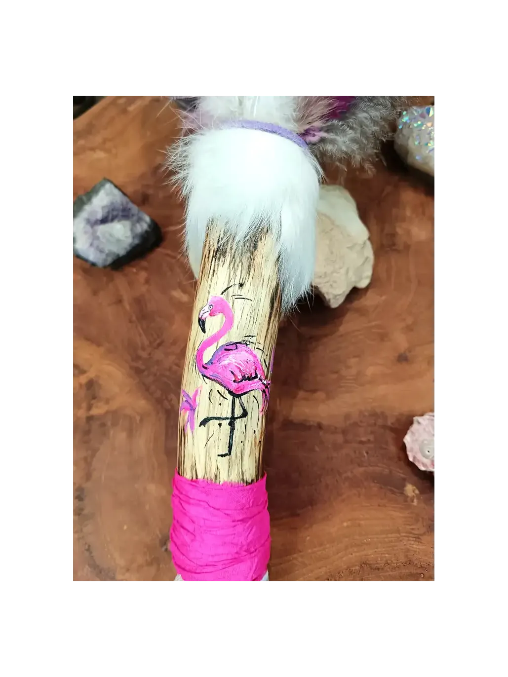 D'une pure puissance chamanique, il est une véritable ode à la médecine du cœur et à la résilience. Son manche, enveloppé d'un luxueux tissu de sari et d'une douce fourrure de lapin recyclée, révèle une peinture délicate et artisanale du Flamant Rose, gardien de cette création. En le tenant entre vos mains, vous ressentirez immédiatement son équilibre parfait et son ancrage. Son plumage exubérant, mêlant les teintes vibrantes du rose profond aux éclats argentés et noirs, crée un bouclier d'air capable de dissiper la brume mentale et les blocages émotionnels.