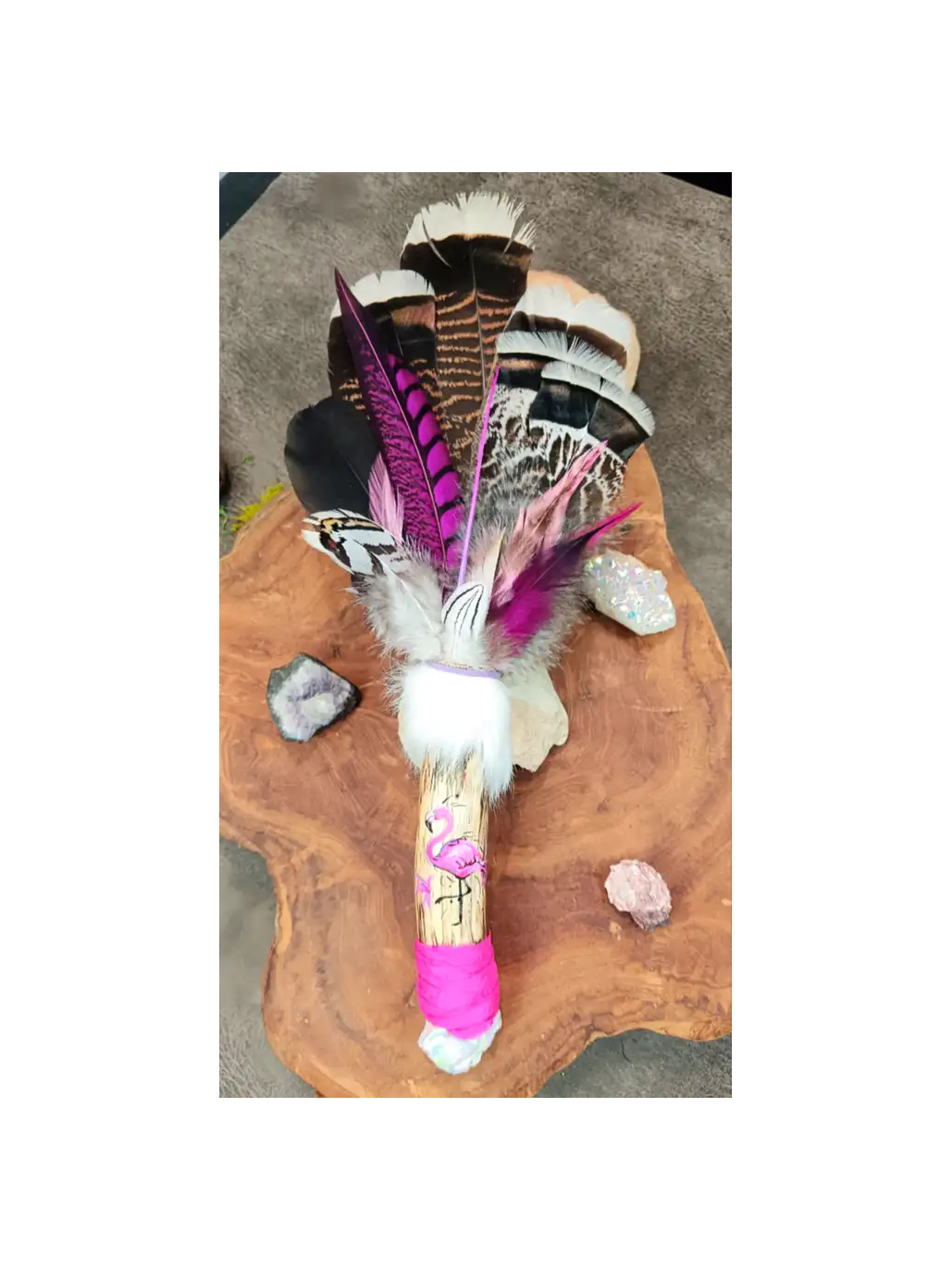 L'Animal Totem du Flamant Rose & Les Plumes : Le Flamant Rose est le symbole ultime de l'équilibre, de la sociabilité et de la guérison du chakra du cœur. Il vous invite à embrasser vos émotions avec grâce. Le majestueux assemblage de plumes (dindon rare, corbeau mystique, faisan vénéré, coq et oie) apporte la médecine de l'Air. Le corbeau perce les illusions, tandis que les plumes de dindon appellent l'abondance et la protection.