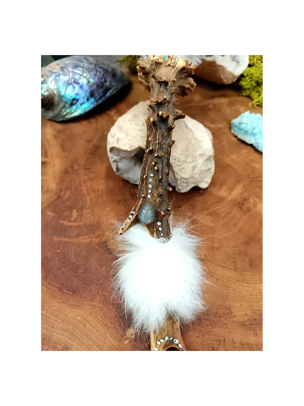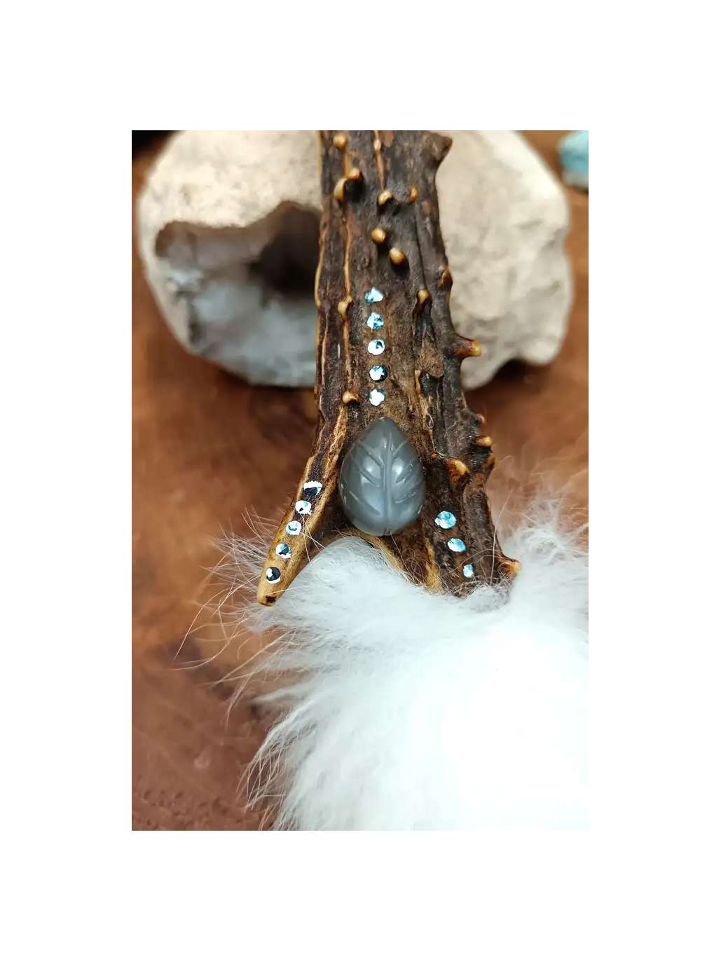 La Synergie Rituelle : L'enracinement terrestre du bois de chevreuil s'unit à l'élévation spirituelle de la pierre de lune et des plumes. Cette synergie parfaite permet de diriger les fumigations avec un ancrage total tout en restant connecté aux sphères supérieures.