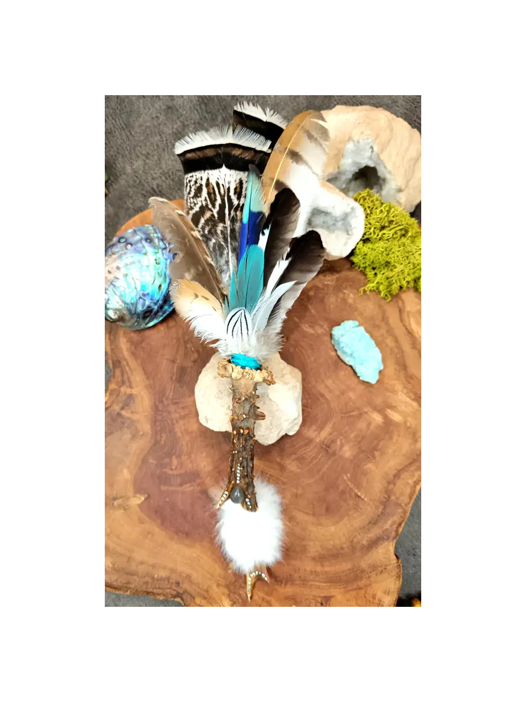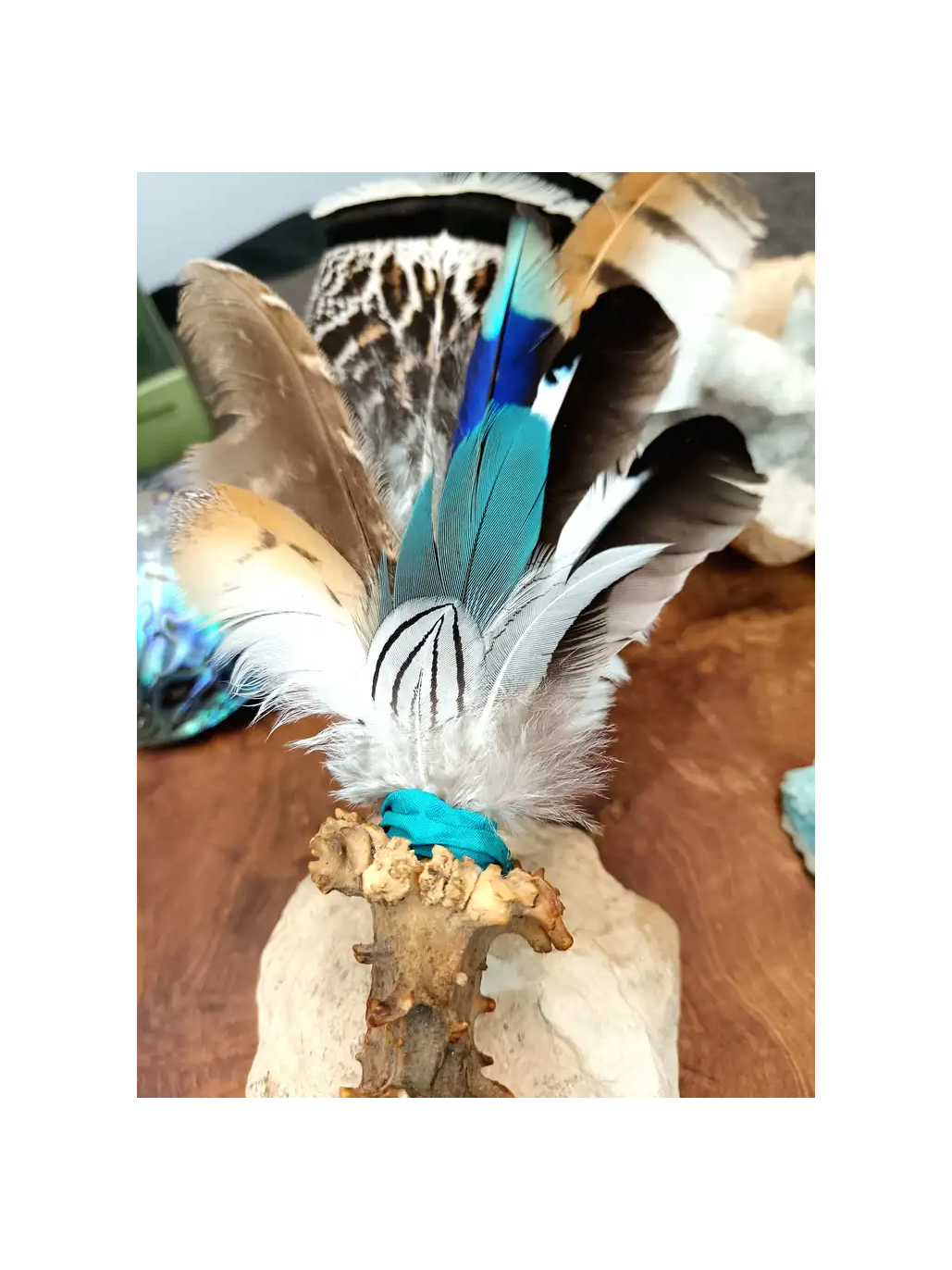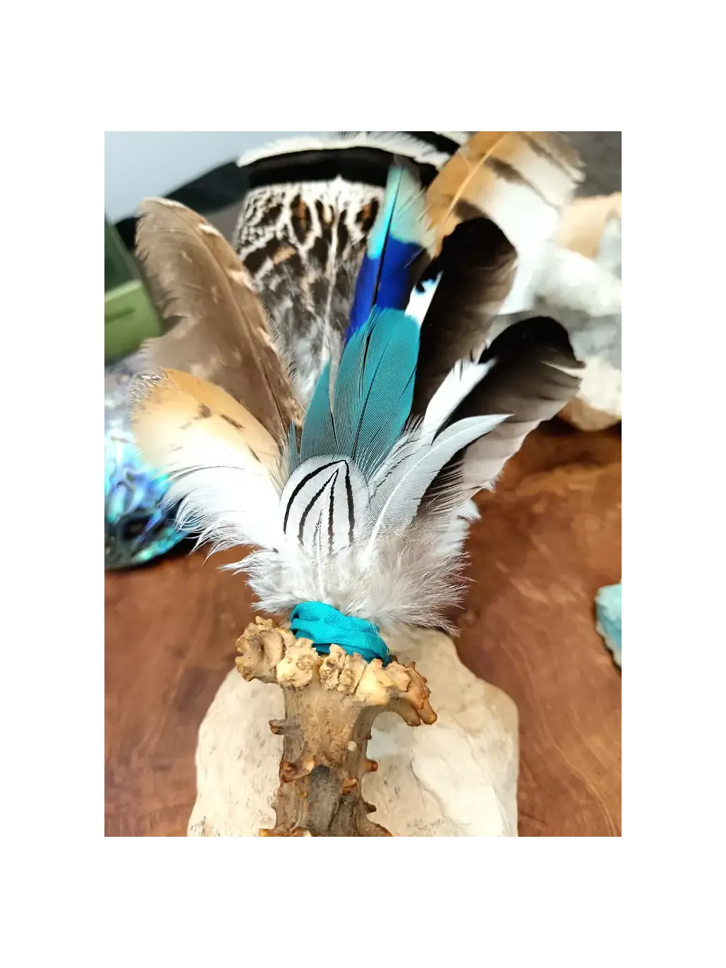 La médecine de l'Air s'exprime à travers un majestueux bouquet de plumes glanées avec éthique. La sagesse silencieuse de la chouette, l'éclat communicatif du geai des chênes et du geai indien, la noblesse du faisan argenté et du dindon, ainsi que la touche vibrante du perroquet s'unissent pour créer un vortex d'énergies purificatrices. Tenez "Ombre Lunaire" entre vos mains, fermez les yeux, et laissez ce gardien fait main transformer votre pratique spirituelle en un véritable art de guérison.