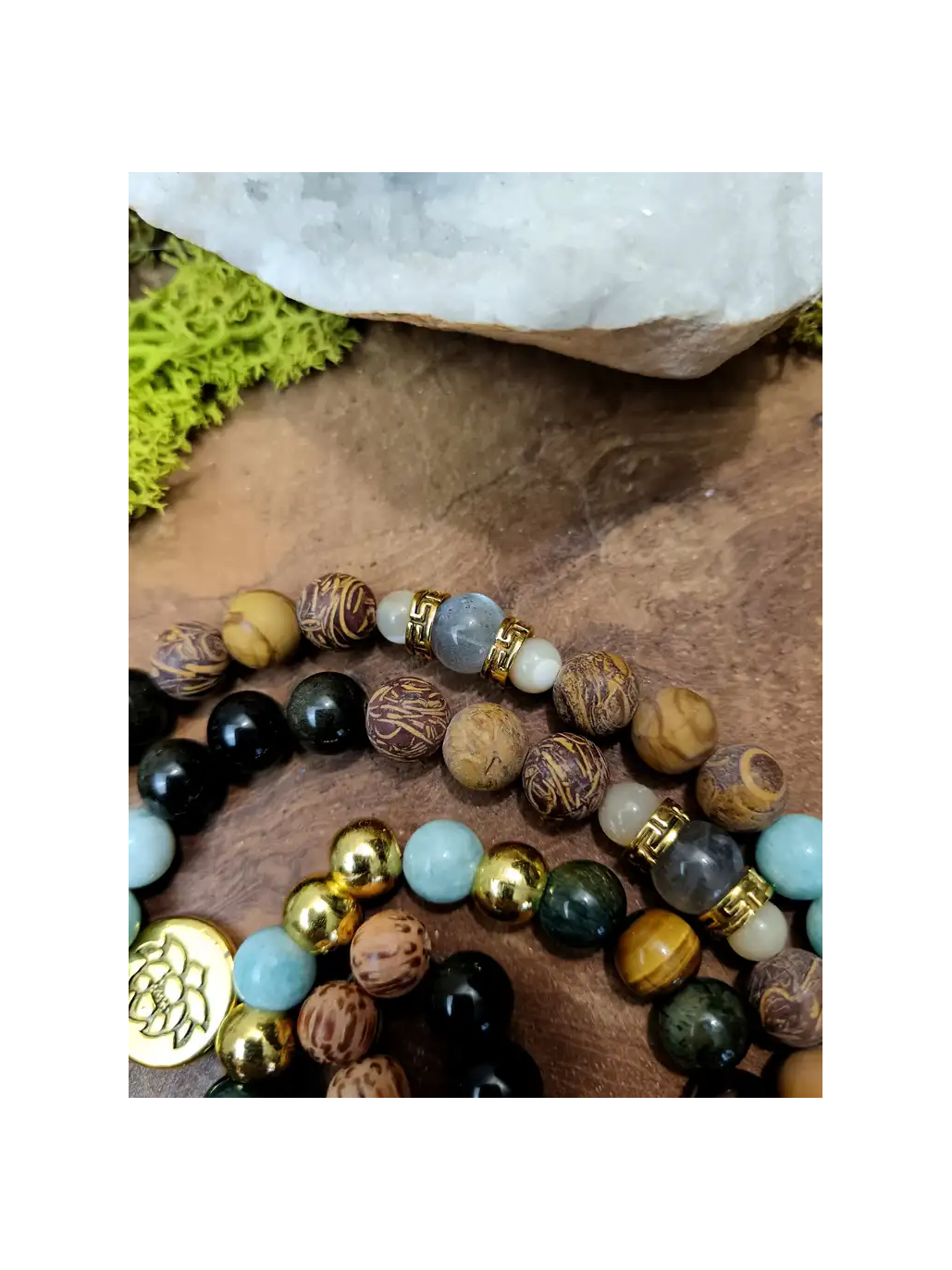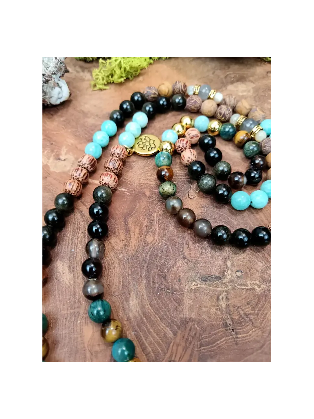 - 💎 108 perles de pierres naturelles : Amazonite, Agate, Labradorite, Œil de Tigre, Obsidienne Dorée, Jaspe, Bois de Palmier, Nacre, Métal Doré