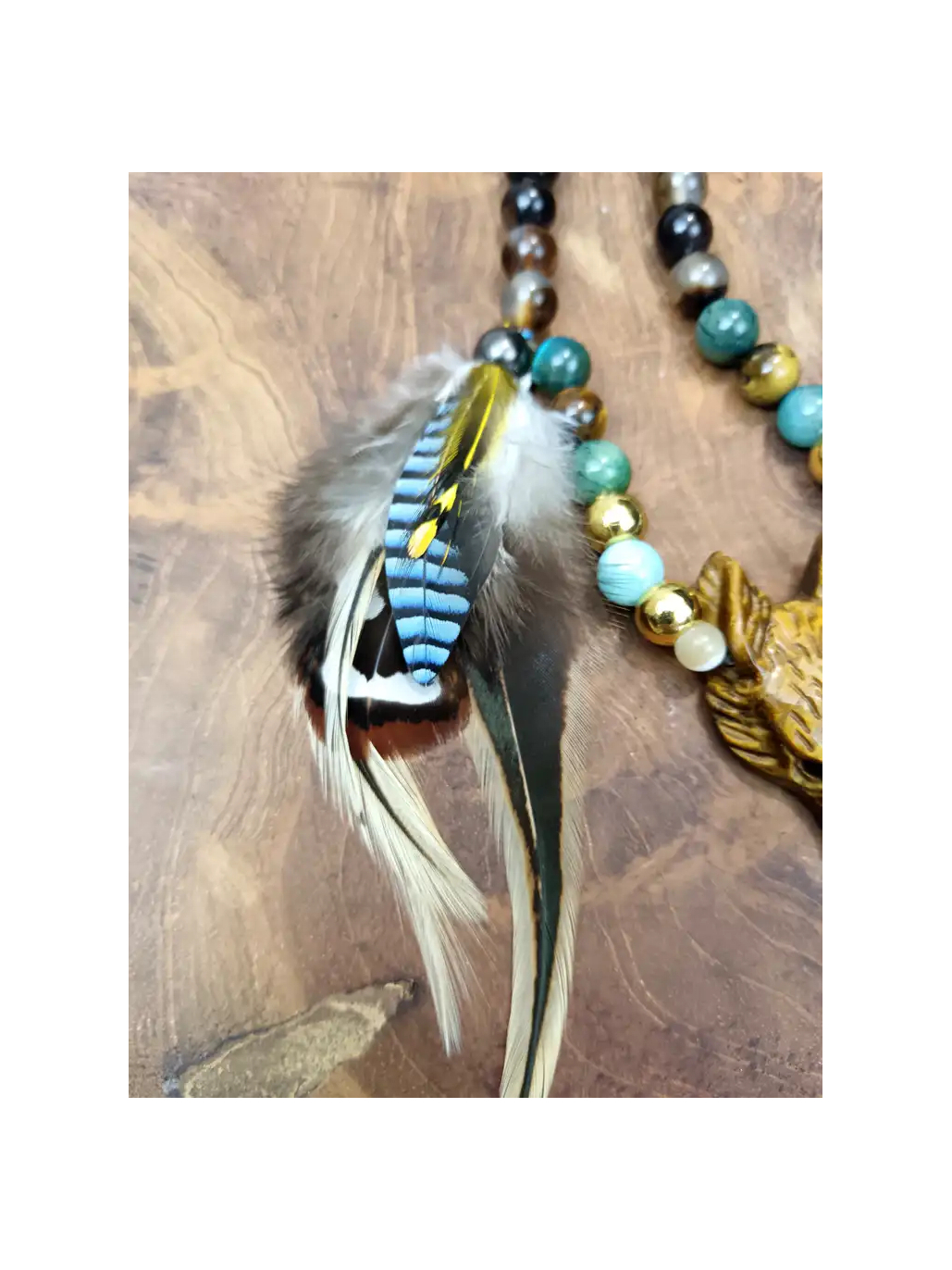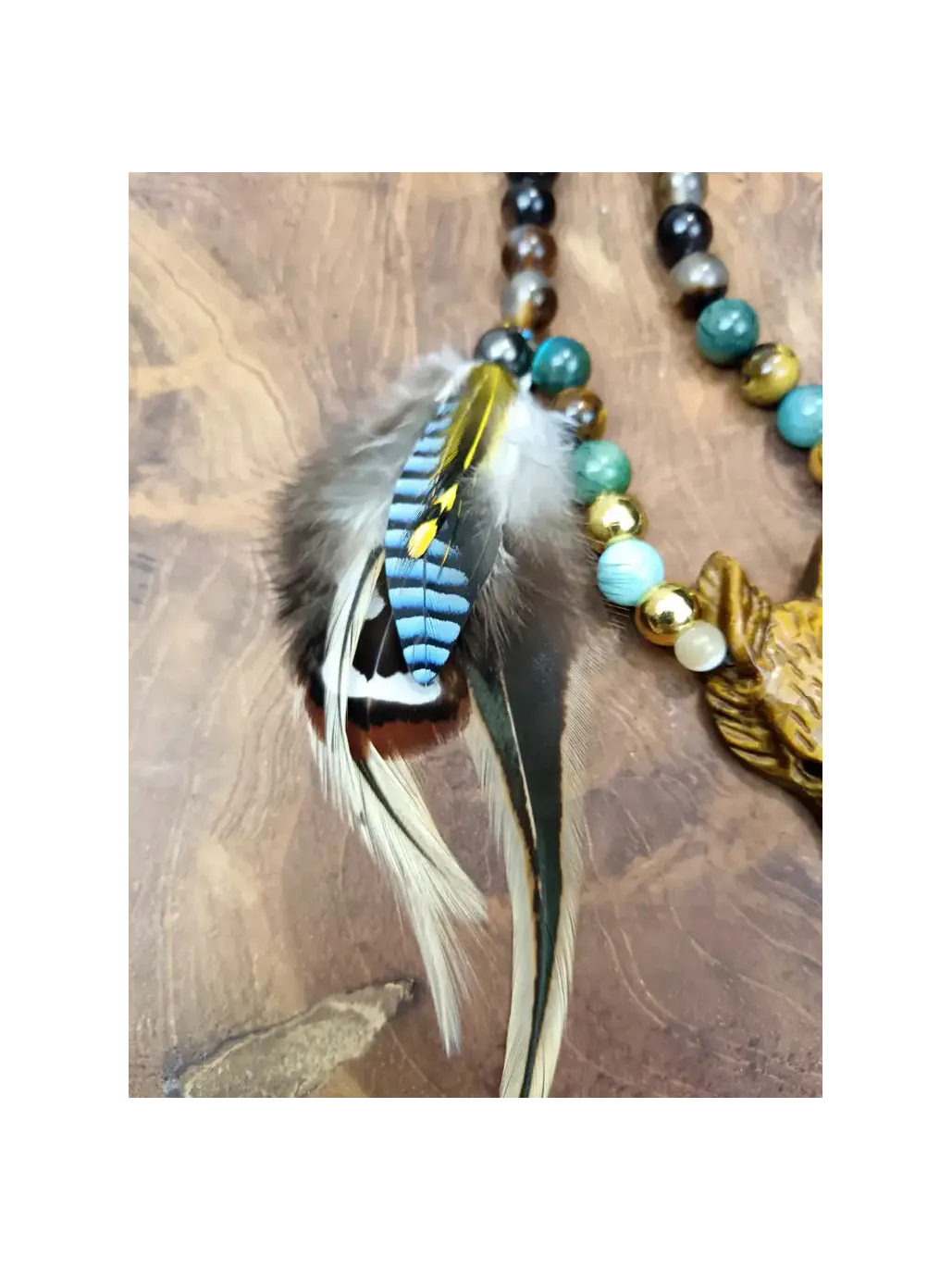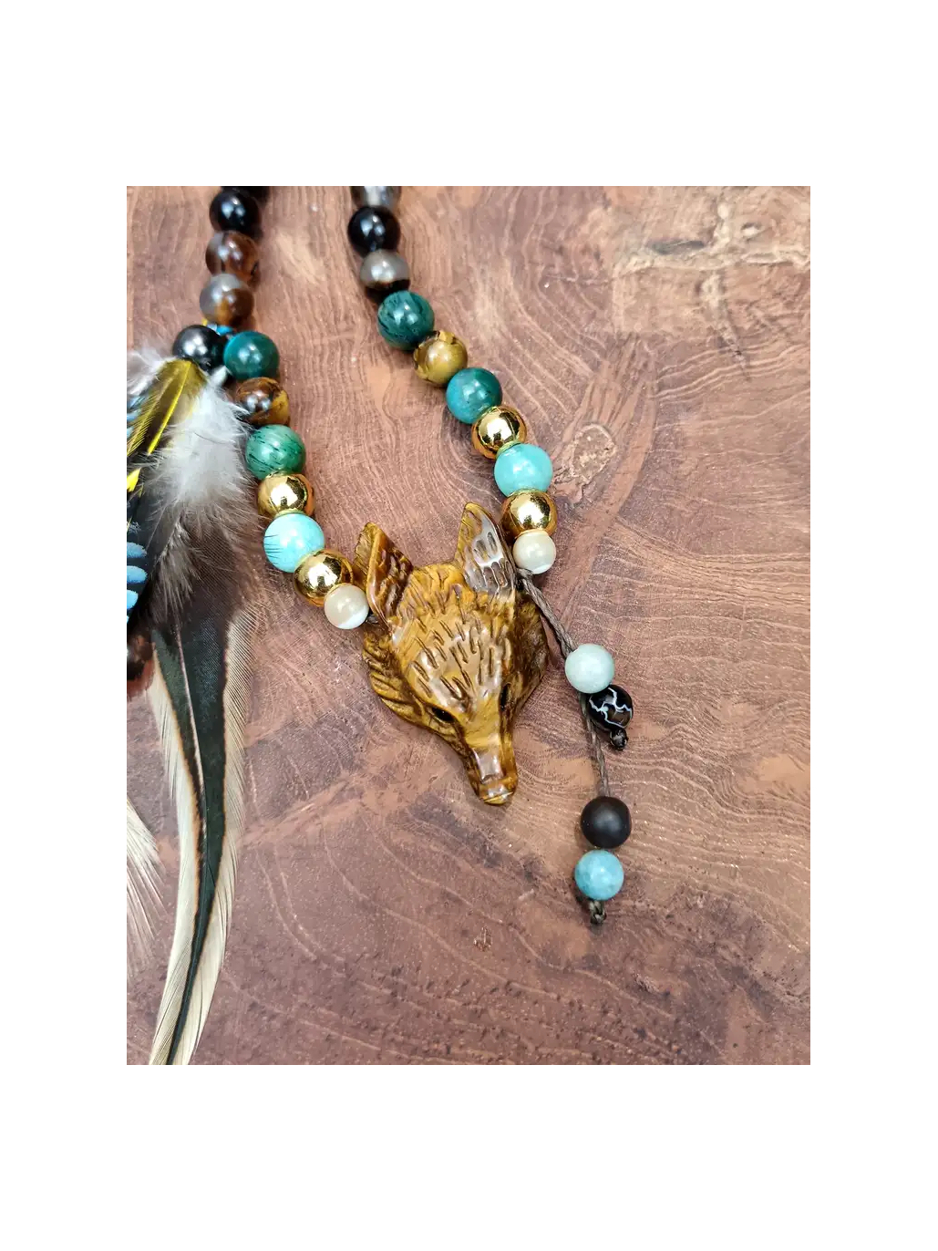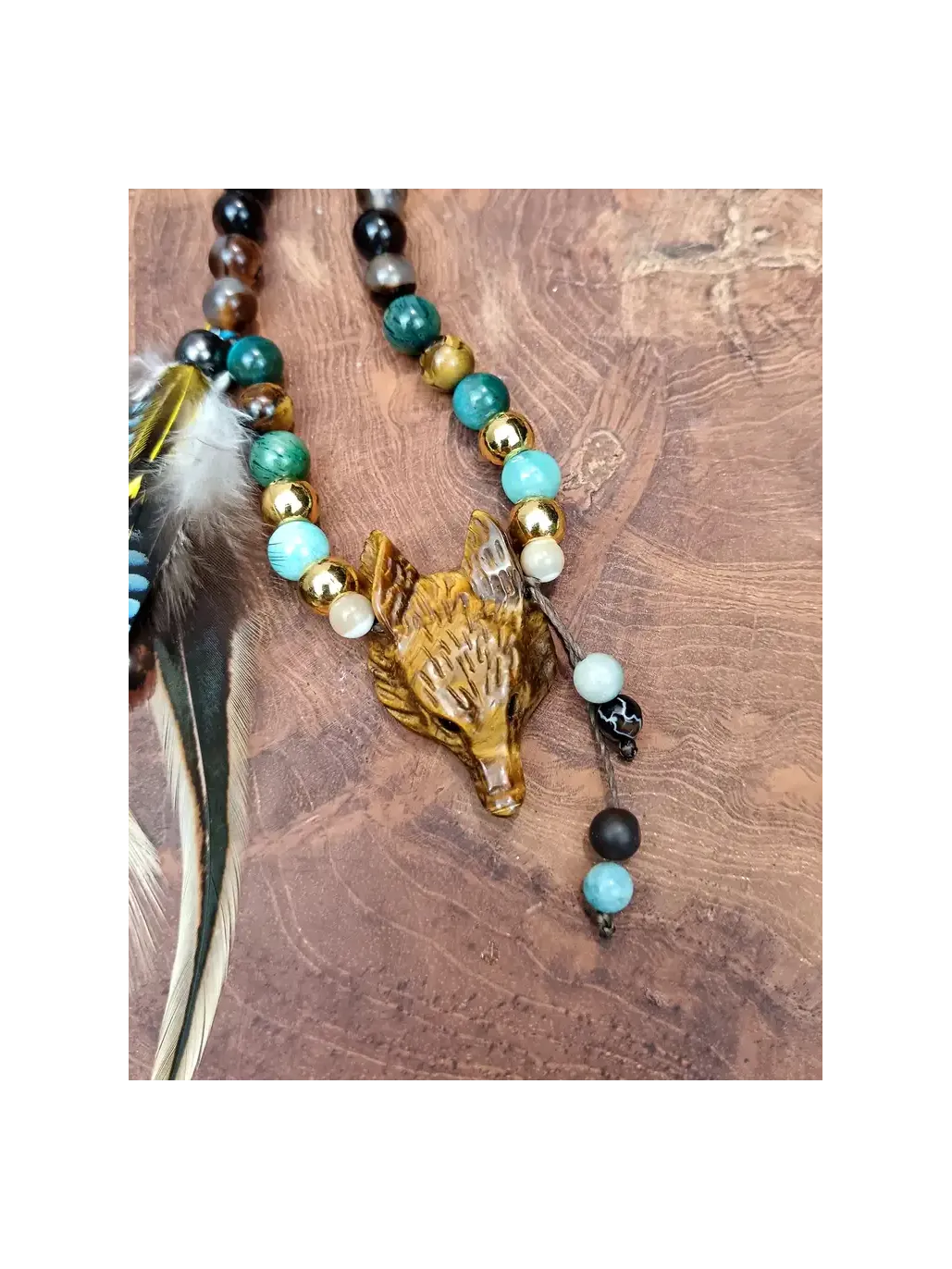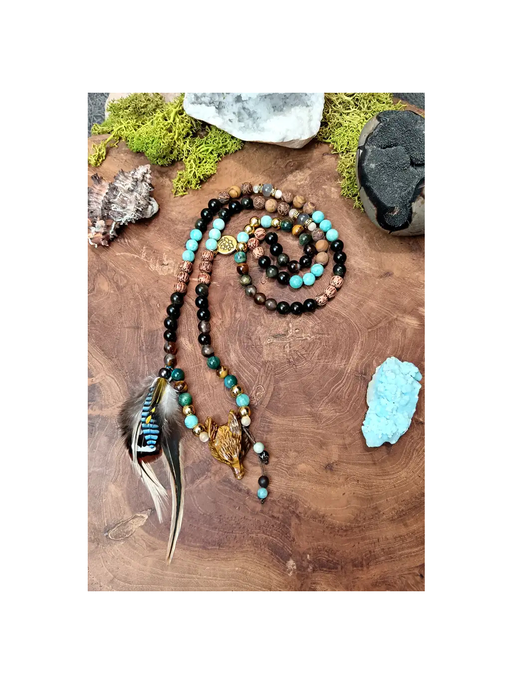 Et au bout de ce chemin, il vous attend. La tête de renard sculptée à la main dans l'œil de tigre — cette pièce centrale d'une beauté et d'une précision saisissantes, visible dans les photos avec ses détails dorés et ses reflets chatoyants de miel brûlé — est le cœur vivant du mala. Elle n'est pas une décoration : c'est un totem actif, une présence. Le renard vous regarde avec ses yeux d'ambre et vous dit : "Je vois ce que les autres ne voient pas. Viens. Je t'enseigne." À ses côtés, les plumes de faisan vénéré, de geai et de coq descendent comme une offrande aux esprits des forêts — légères, sauvages, libres — tandis que la breloque fleur de lotus rappelle, avec douceur, que toute cette magie s'épanouit toujours depuis la boue, depuis le fond des eaux sombres, vers la lumière.